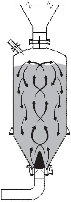 4. 壓縮空氣從N個(gè)向上的噴嘴中以脈沖循環(huán)的方式噴出。通常壓縮空氣脈沖的范圍從大約2秒或更短的短啟動時(shí)間,到更長可超過60秒的停止時(shí)間。這個(gè)混合動作向上提升干散固體的中央部分,并同時(shí)向下移動干散固體的周邊部分,翻轉(zhuǎn)滾動物料以達(dá)到均勻的混合。